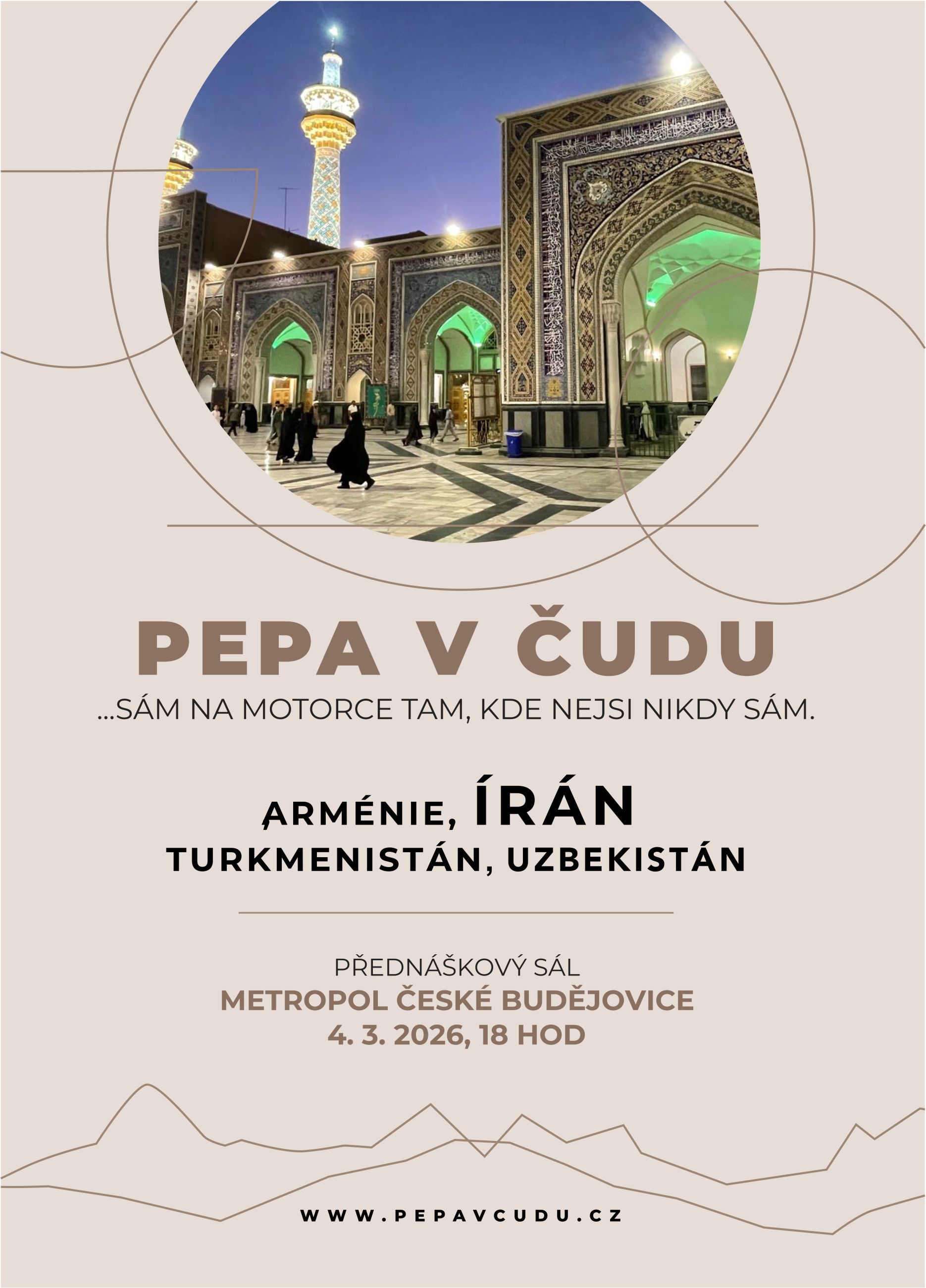 Nahlédneme do obrovské země s nepěknou pověstí a nádhernými lidmi. Země barevných pouští a pestrobarevných měst. Projedeme Tabríz, Teherán, dáme si kafe s vyhlídkou na nejvyšší sopku Asie a prozkoumáme Mašhad – velké město s nepopsatelně silnou vírou… A taky si na pobřeží Kaspického moře koupíme tričko – skoro za hubičku!