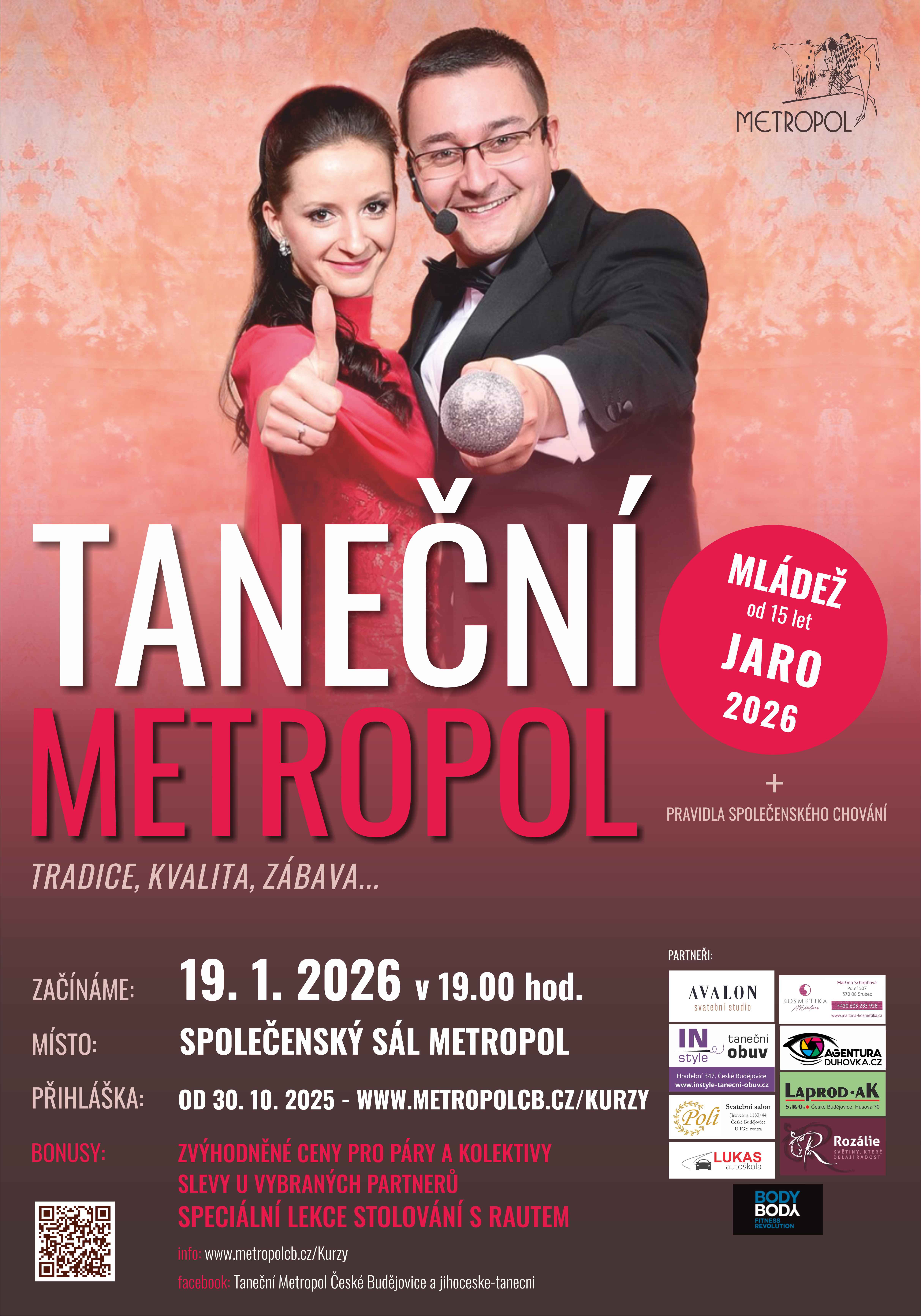 Chcete se naučit tančit, poznat nové přátele a zažít spoustu zábavy? Přihlaste se do našeho tanečního kurzu pro mládež! Během 12 lekcí zvládnete standardní i latinsko-americké tance a osvojíte si zásady společenského chování. Součástí je také speciální lekce stolování s rautem. Na závěr vás čeká prodloužená a věneček s živou hudbou a soutěžemi o ceny...