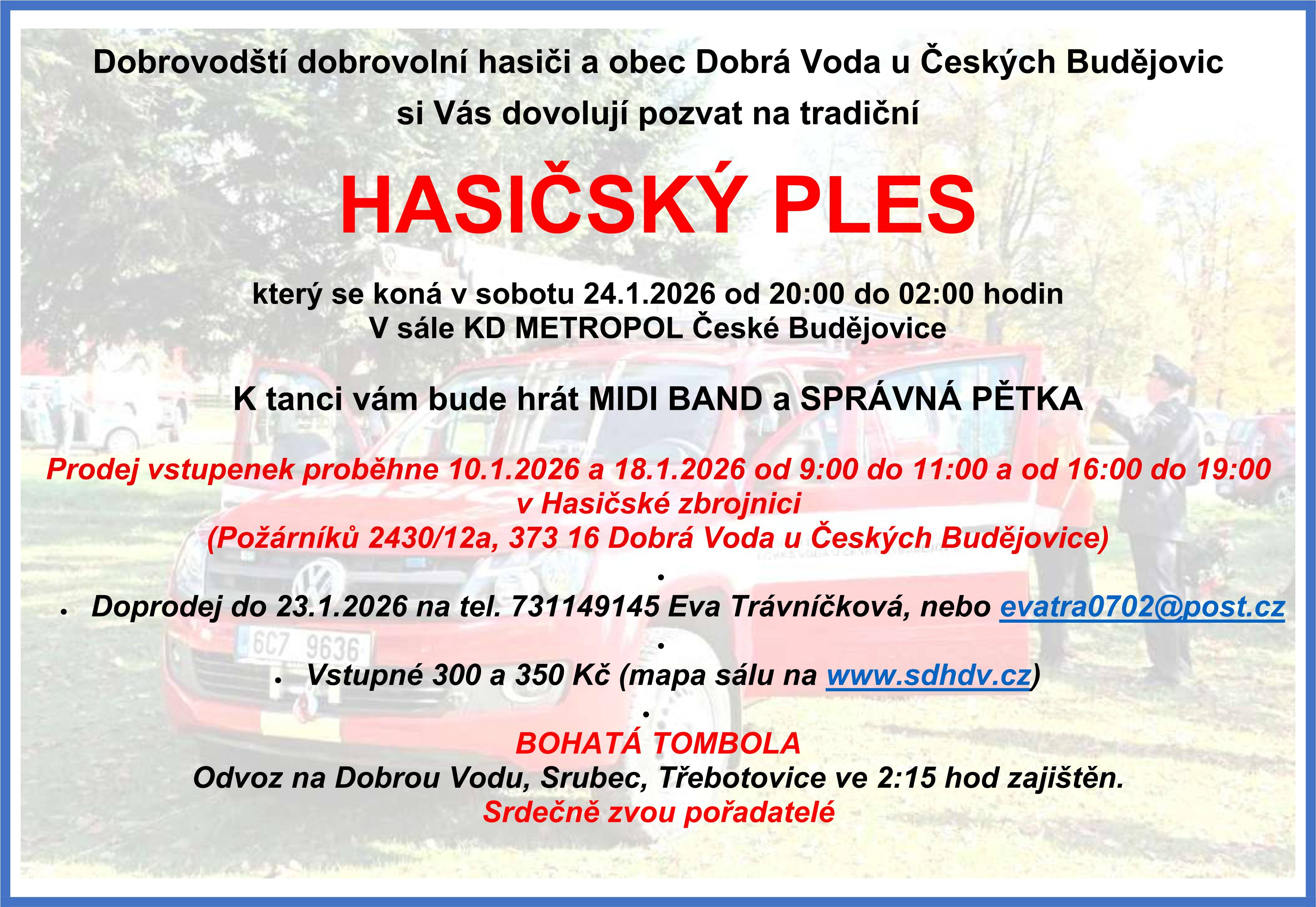 Dobrovodští dobrovolní hasiči a obec Dobrá Voda u Českých Budějovic si Vás dovolují pozvat na tradiční HASIČSKÝ PLES.
