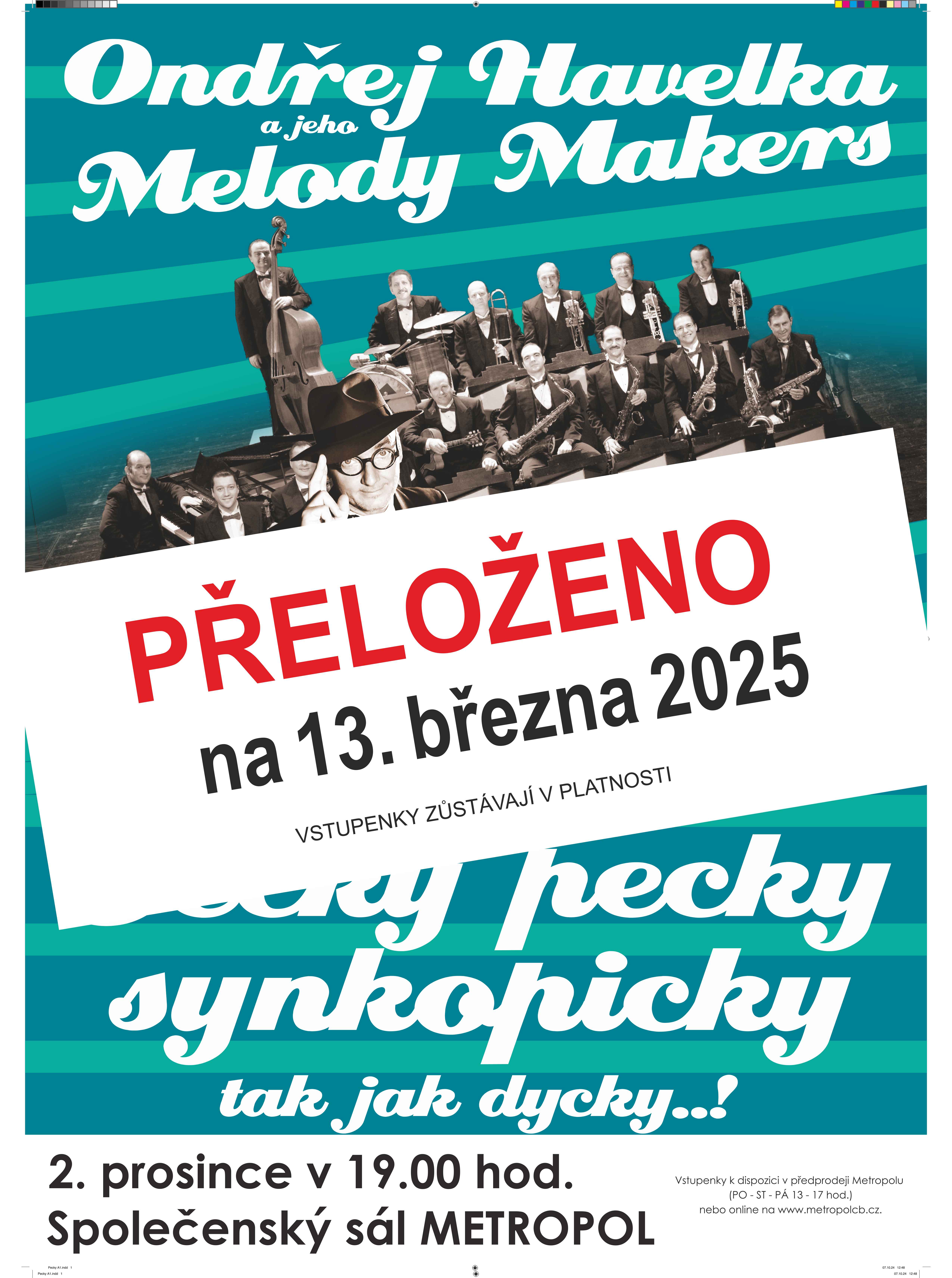b) vstupenky zakoupené online - v tomto případě prosíme o zaslání emailu na predprodej@metropolcb.cz s uvedením názvu pořadu, čísla řady a sedadla.