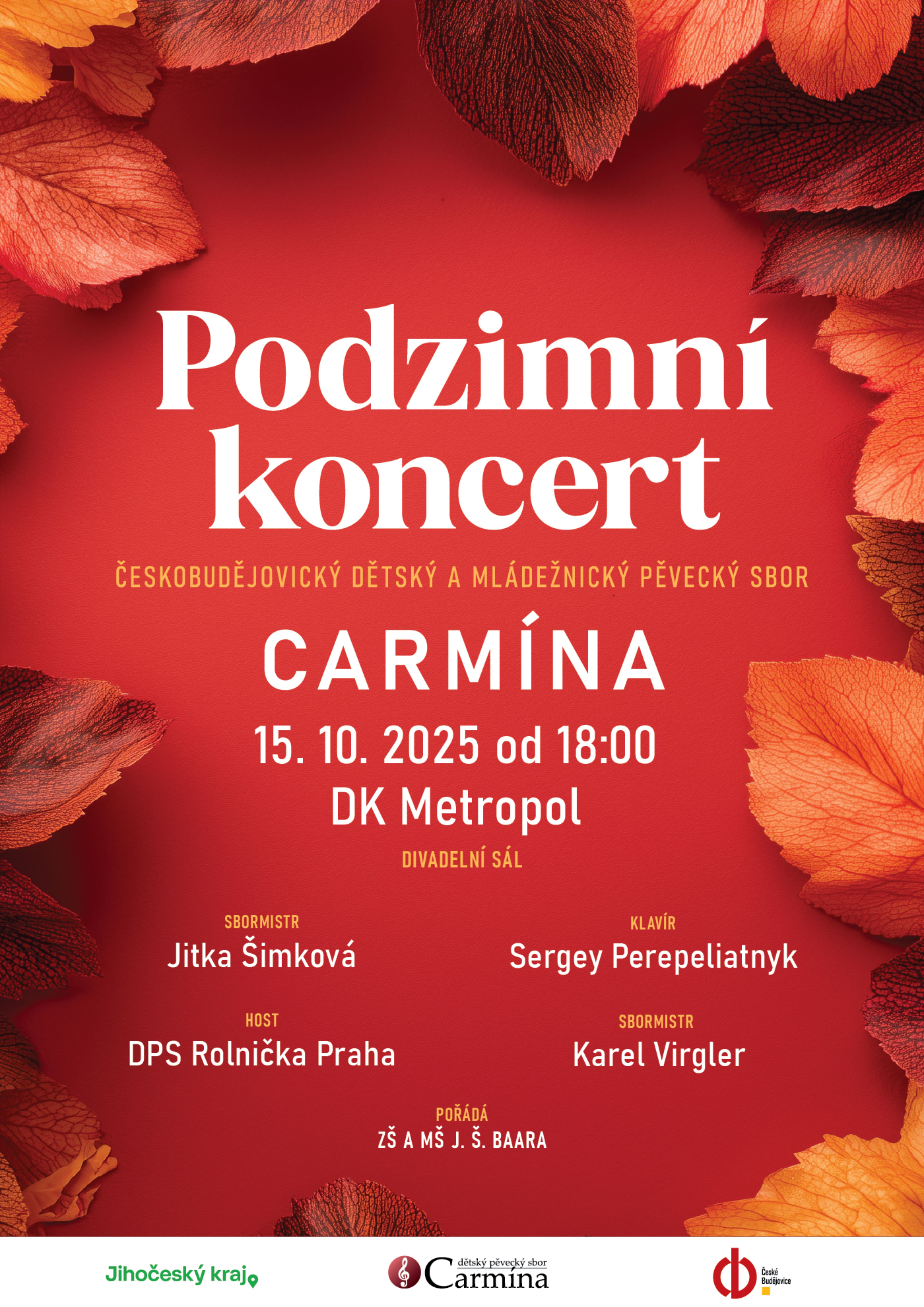 Srdečně Vás zveme na Velký sborový podzimní koncert Českobudějovického dětského a mládežnického pěveckého sboru CARMÍNA . Vystoupí všechna oddělení pod vedením sbormistryně Jitky Šimkové a koncertního klavíristy Sergee Perepeliatnyka.