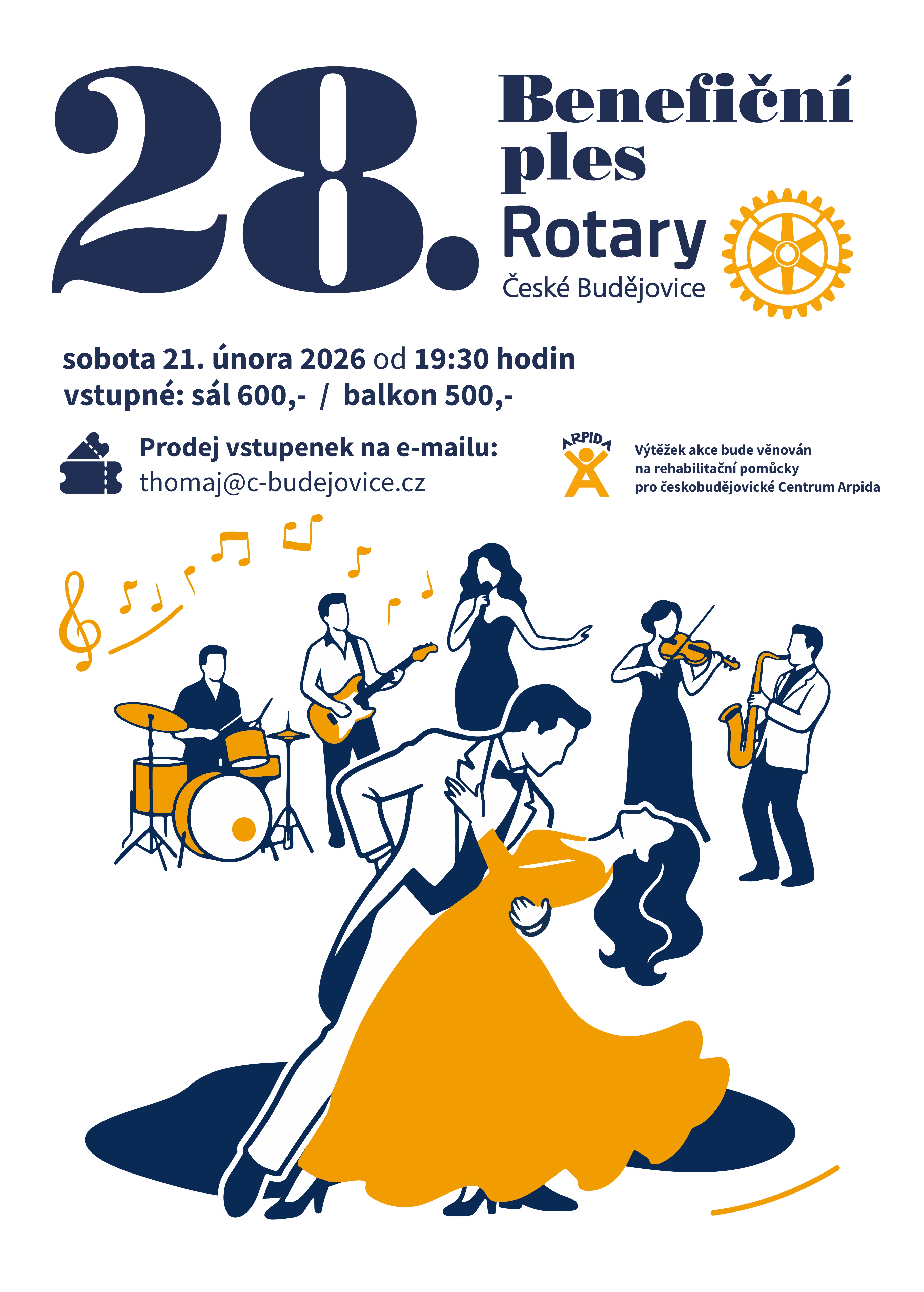srdečně Vás zveme na 28. Benefiční ples Rotary klubu České Budějovice, který se uskuteční v sobotu 21. února 2026 v DK Metropol v Českých Budějovicích.