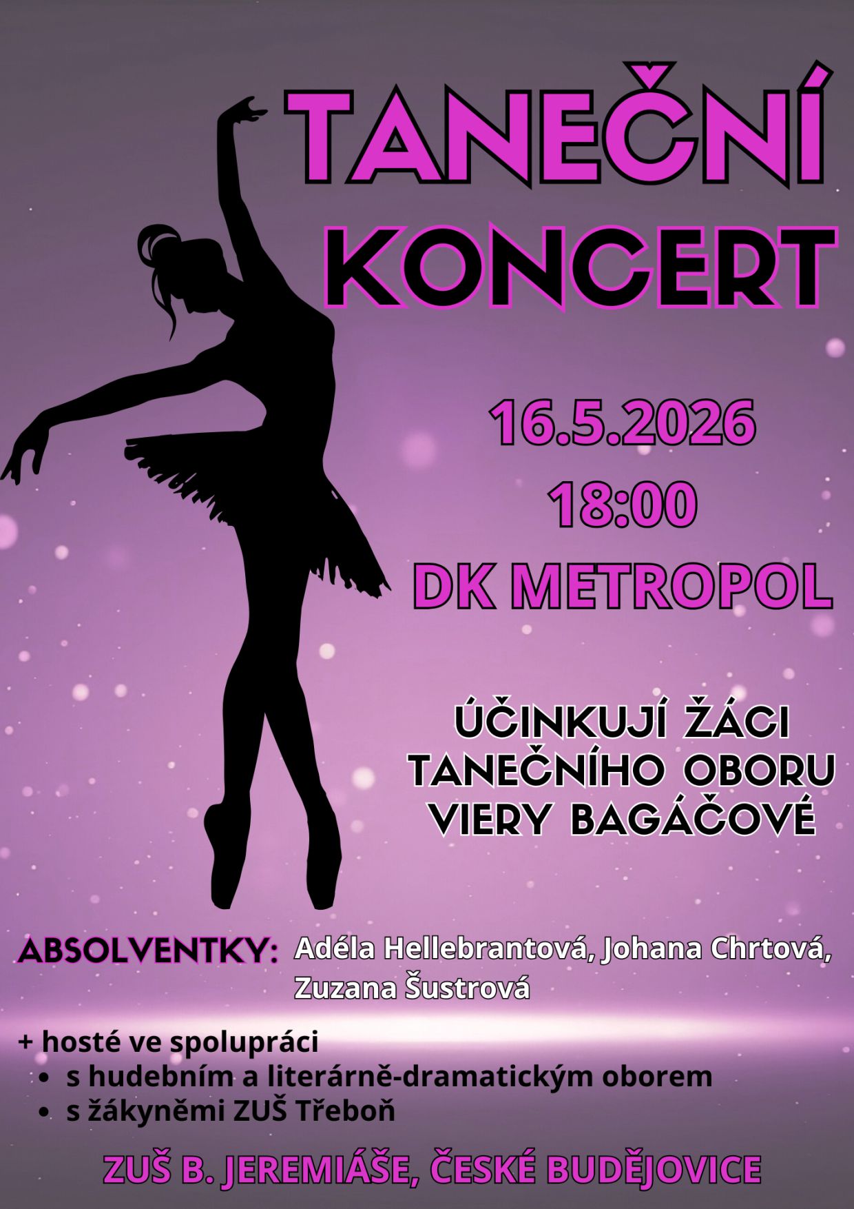 Dne 16. 5. 2026 se uskuteční v divadelním sále DK Metropol Taneční koncert, na kterém se představí žáci tanečního oboru paní učitelky Viery Bagáčové. Koncert proběhne ve spolupráci s hudebním a literárně dramatickým oborem naší školy a s žákyněmi ZUŠ Třeboň...
