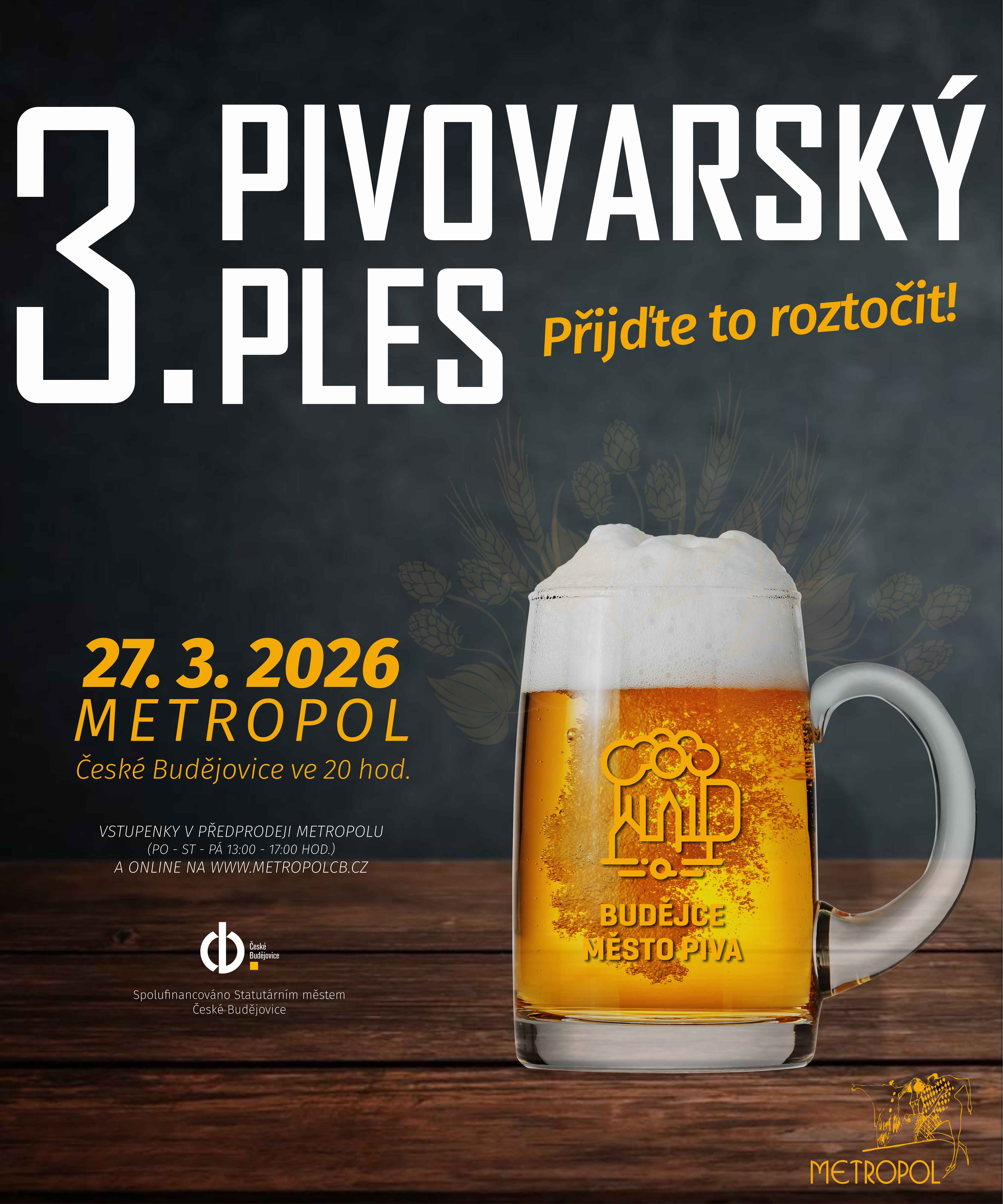 Budějce jsou městem piva! První dva ročníky byly obzvláště vydařené, proto pokračujeme a věříme, že jsme založili tradici. Společně se zúčastněnými pivovary Vás opět srdečně zveme na ples, na kterém nesmí chybět žádný milovník společenské zábavy, tance a především piva! Budete moci ochutnat 14 druhů piv od sedmi pivovarů. O taneční a hudební zážitek se postará Metroklub Big Band, v komorním sále zahraje českobudějovická kapela Rodinný klenoty s rockovými hity od 70. let po současnost. Dalším hudebním hostem večera bude kapela Honzy Křížka Akustik Band s širokou škálou vlastní i převzaté tvorby. Moderátor Milan Džuba bude provázet celý večer slovem a na závěr diskotékou. Začínáme v pátek 27. března ve 20 hodin, očekávaný příchod hostů v 19.30 hod.