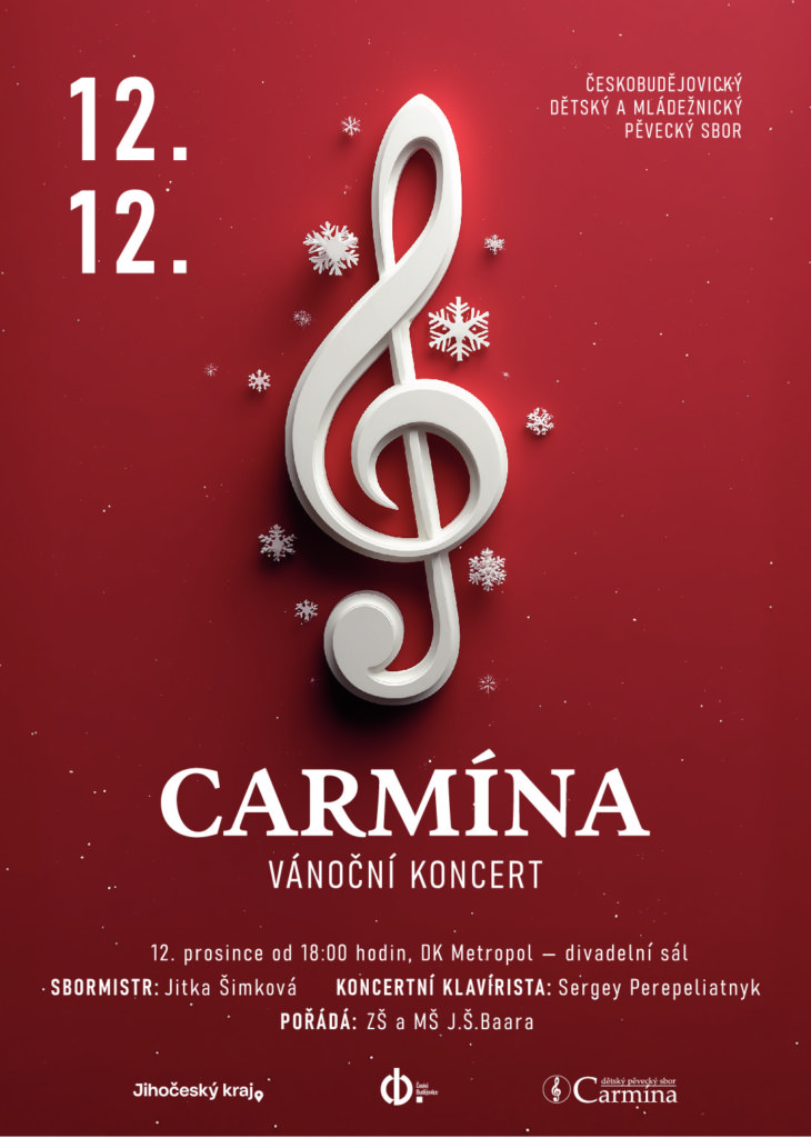 Srdečně Vás zveme na tradiční Vánoční koncert českobudějovického mládežnického a dětského pěveckého sboru Carmína, pod vedením sbormistryně Jitky Šimkové a koncertního klavíristy Sergee Perepaliatnyka. Zazní tradiční vánoční písně a kolegy, skladby duchovní, písně zimního období, skladby našich a zahraničních autorů.
