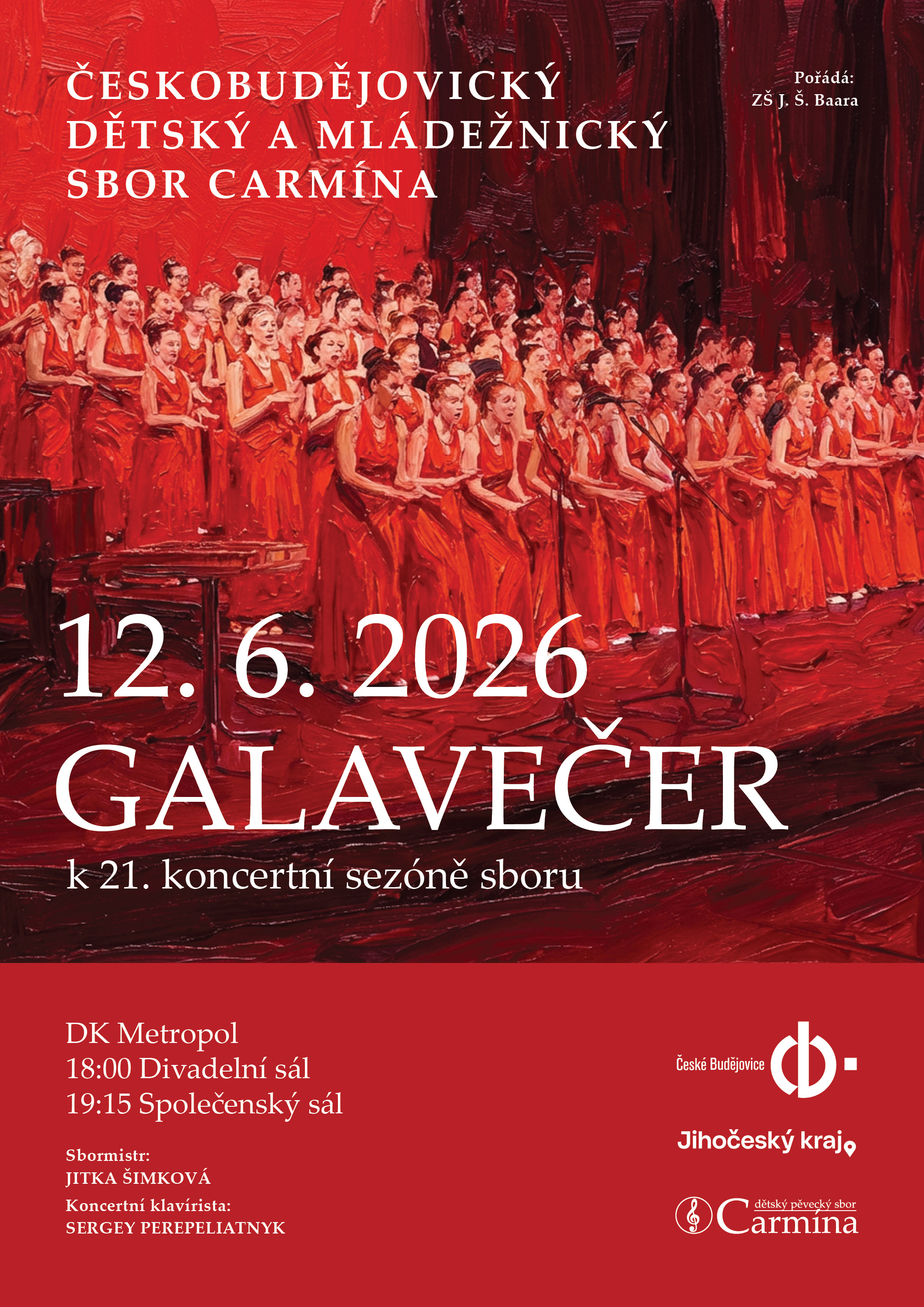 Srdečně Vás zveme na slavnostní koncertní část galavečeru k 21. koncertní sezóně Českobudějovického mládežnického sboru Carmína. Vystoupí všech osm oddělení od 3 do 29 let v počtu 280 členů sboru. Moc se na Vás těšíme...